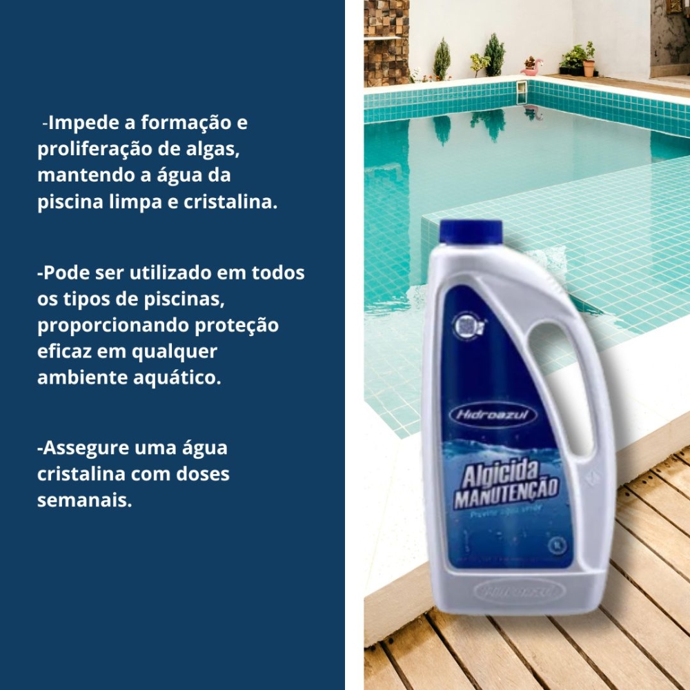 O Algicida de Manutenção Hidroazul 1L é o aliado perfeito para manter sua piscina sempre cristalina, limpa e protegida contra o aparecimento de algas. Sua fórmula altamente eficaz previne a formação de algas verdes, marrons e amareladas, mantendo a água saudável e agradável para o uso.