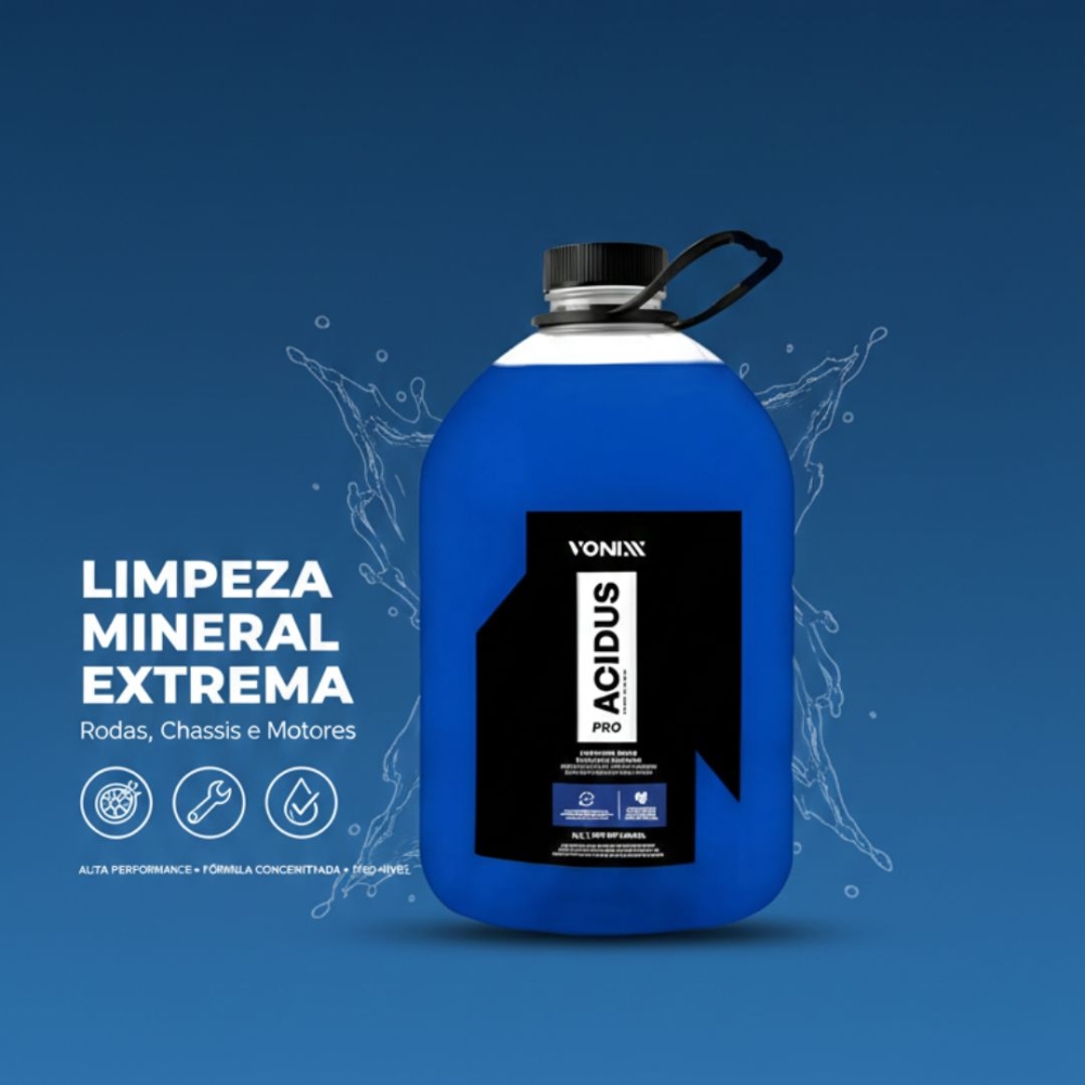 O Acidus Pro não é apenas um desincrustante para chassi; é um limpador ácido multifuncional de alta performance da linha profissional Vonixx. Sua fórmula balanceada foi projetada para quem busca detalhamento de precisão, agindo na remoção de sujeiras minerais e oxidações que produtos comuns não conseguem atingir.