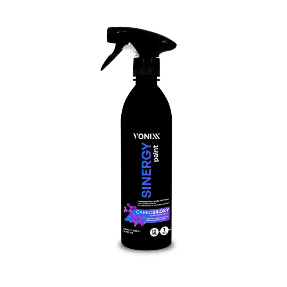 Sinergy é coating spray de fácil aplicação desenvolvido para pintura de automóveis e tem como função proteger a pintura por até 12 meses. O diferencial desse produto é a sua tecnologia exclusiva vonixx, carbosiloxy, onde o elemento químico carbono age em sinergia com o silício e com isso, forma um filme resistente e super hidrofóbico e tem um tempo de cura menor, em média 60 minutos. Além disso, esse produto reduz o atrito, minimizando riscos e promovendo um excelente brilho.